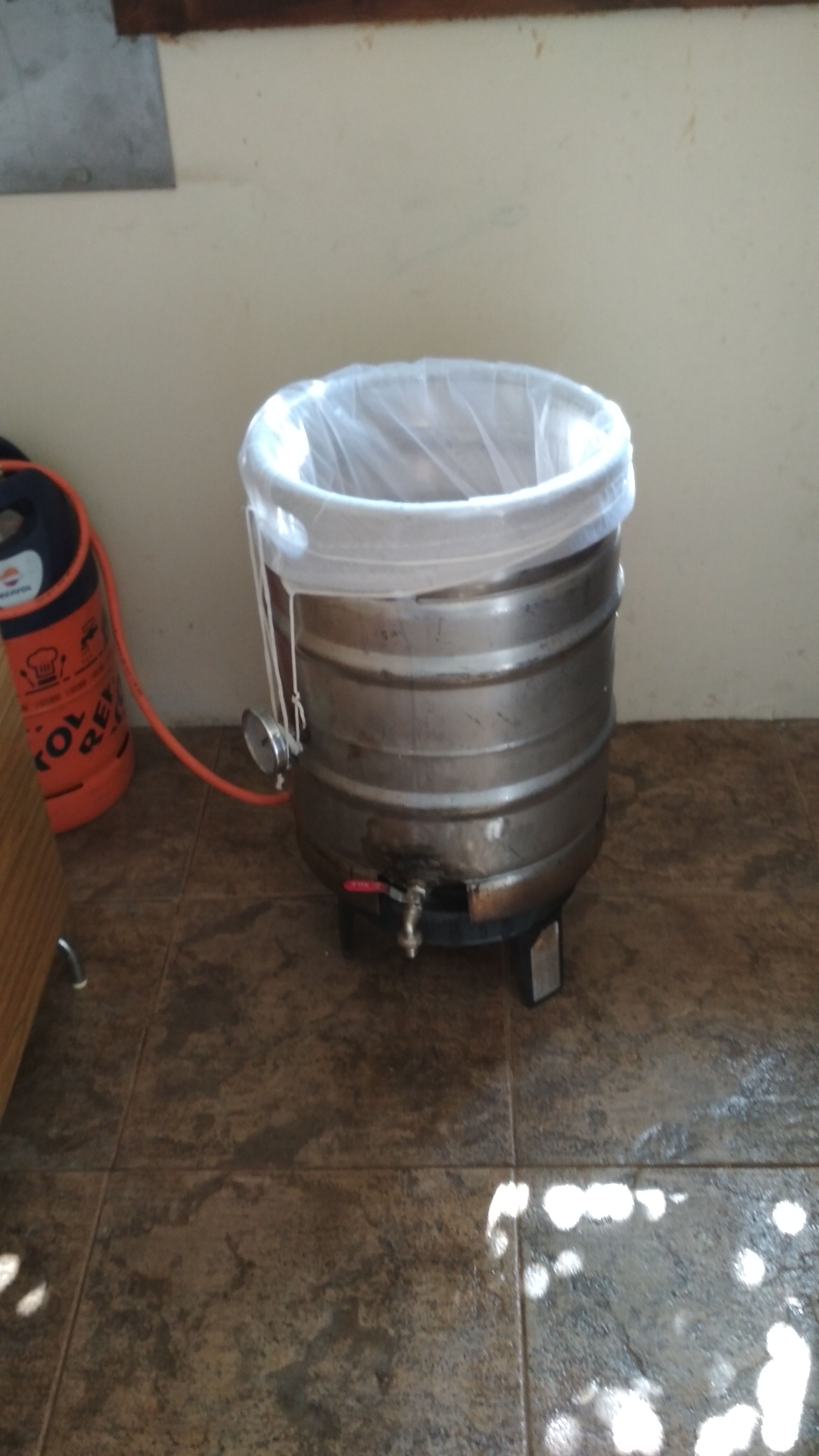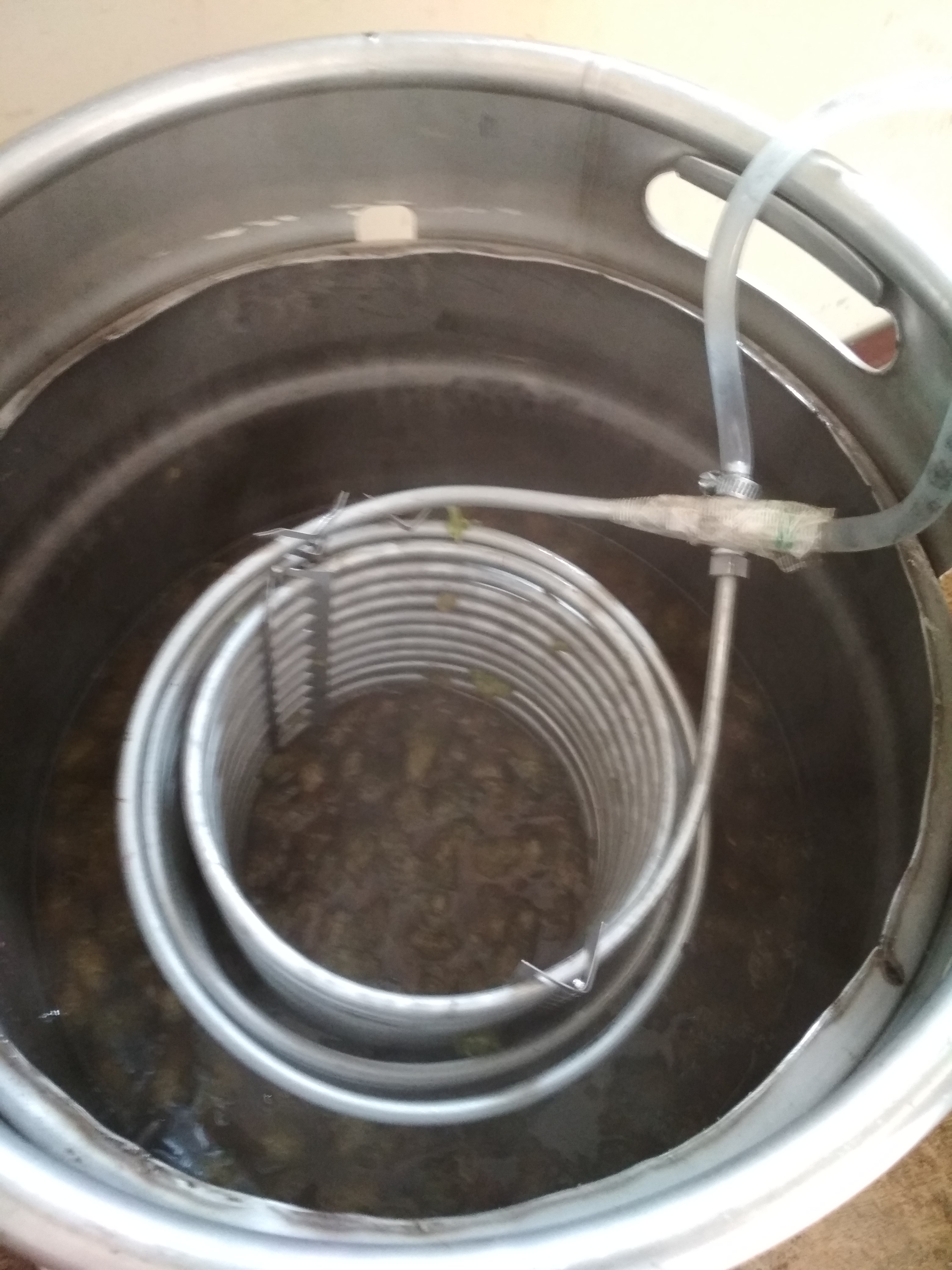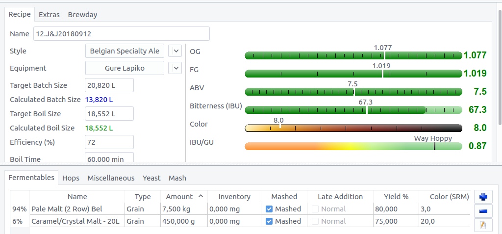 Azkenean irailaren 12an bildu ginen eta lote bat egin genuen, behintzat kurtsoari hasiera emateko… Gure errezetan, lupulu freskoak erabiltzen ditugunez, lupuluaren kopurua x 3 biderkatu dugu (70gr ordez, 200 erabili genituen), guztira 1075gr, errezetan agertzen den moduan. Mazerazioaren tenperatura altua zenez, bukaerako dentsitatea altua geratu zen, beraz, «gorputzdun» garagardoa espero dugu…