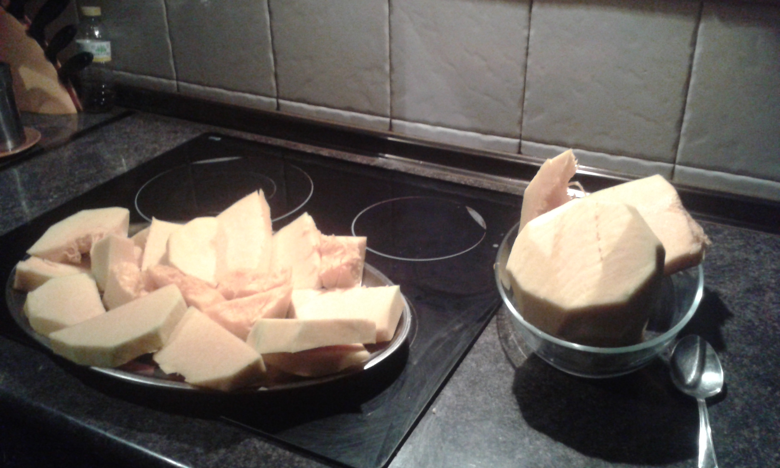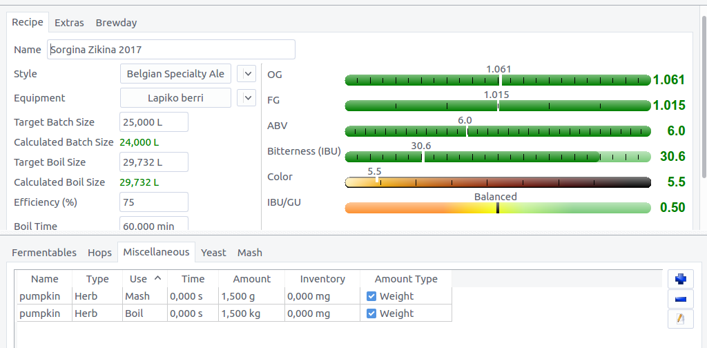Gure ortuko kalabaza (pasaden urtean Buenavistako beste auzokide batena erabili genuelako..) erabili dugu. Labean 4kg kalabaza azukrearekin sartu genituen , baina 3 kg ziren garagardo egiteko momentuan. 1,5 kg mazerazioan eta beste 1,5 kg egozketaren azken 5 minututan.