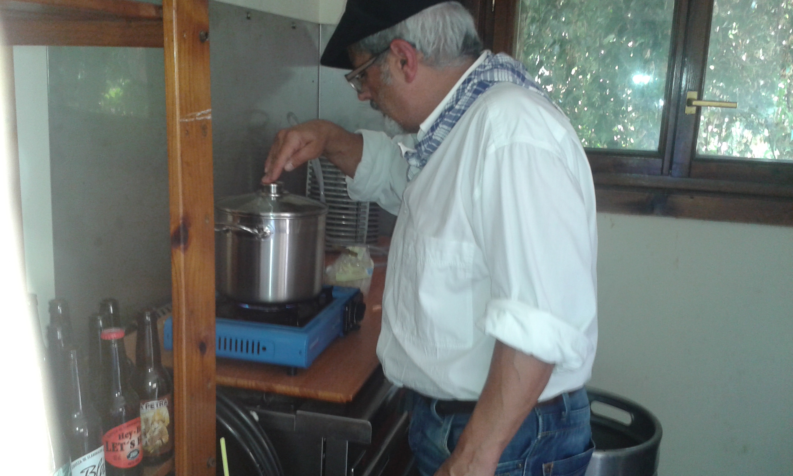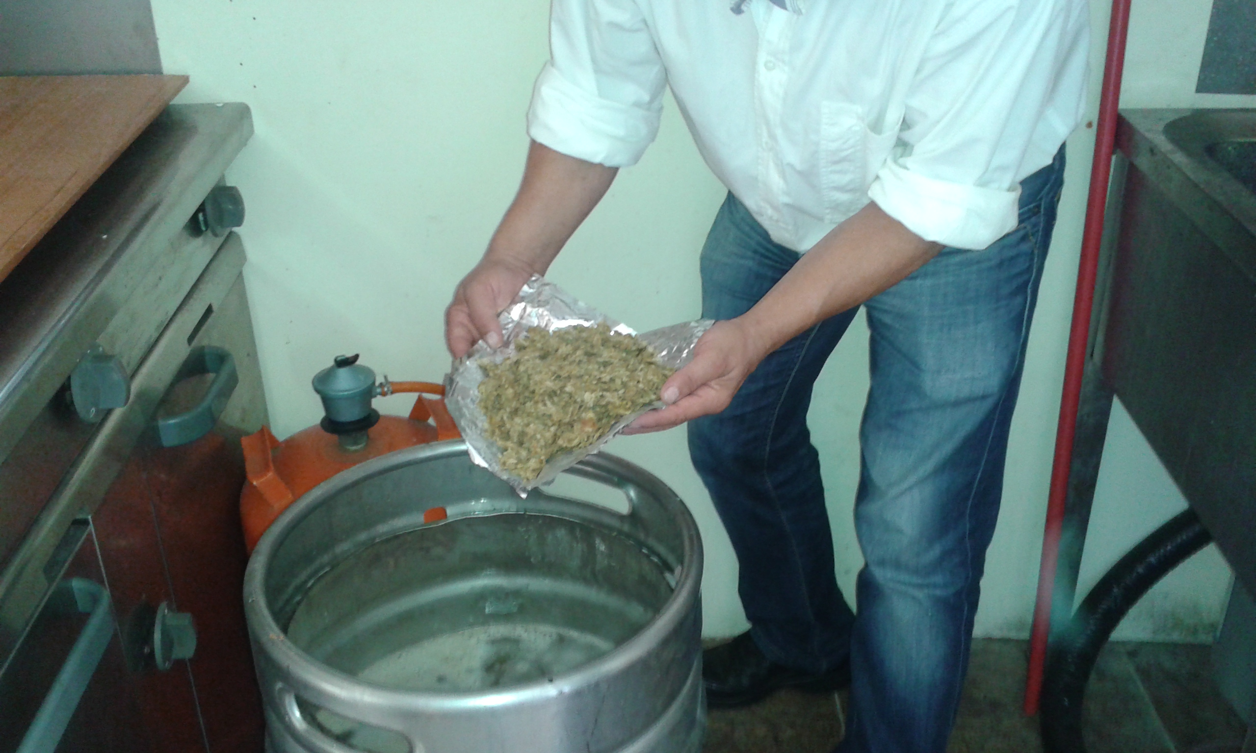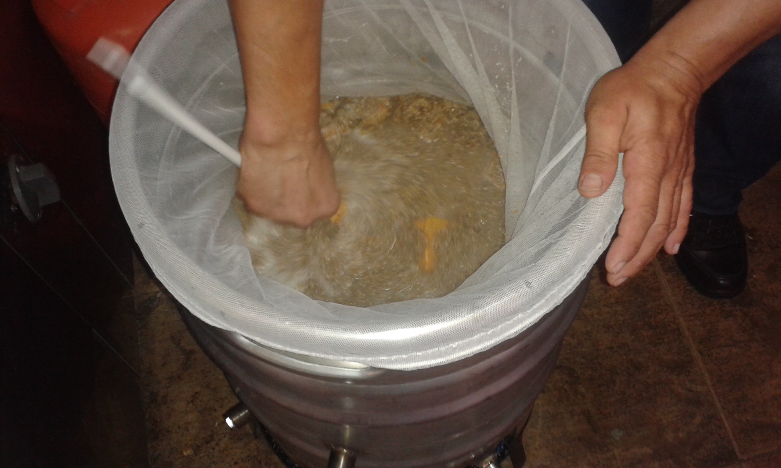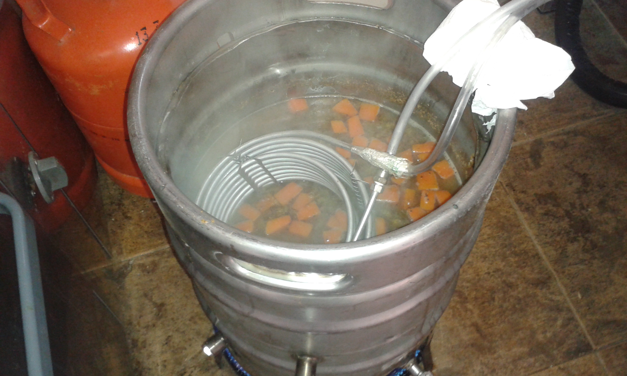 Mazerarioa egiteko lapikoan 7,7 malta pils eta egindako “pastela” zatitan sartu genituen. Malta Laugar ekoizleak Gordexolan daukan fabrikan erosi genuen aurreko egunean. Nafarroako Intermalta enpresako Pils malta erabili genuen, besterik ez, gure garagardoari, kalabazak emateko kolorea eta beste zaporeak. Gero, lupulizazioan, 60 gr Smardgard Eco (5,9 AA) lupulua erabili genituen mingotasuna emateko, egozketan 60 minututan, eta azken 5 minututan Butroi Basatia, Butroi inguruan irailean aurkitu genuena. Gure errezetan beste batzuetan baino pixka bat gehiago gehituko dugu, lupuluak ematen dion mingotasuna gustatzen zaigu eta. Egozketaren azken 5 minututan 50 gr Butroi Basati lupulua gehitu genituen.